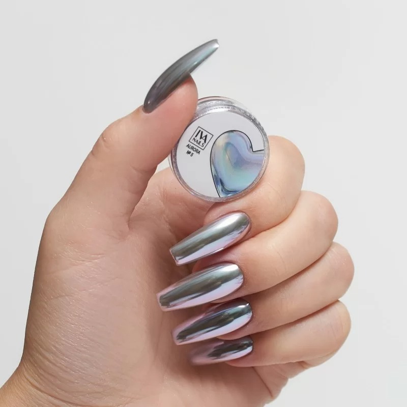 Втирка Аurora имеет мельчайший пигмент, который отражает свет под разными углами и создает зеркальное покрытие с плавными цветными переливами. Каждый оттенок переливается на свету, меняясь с каждым движением.