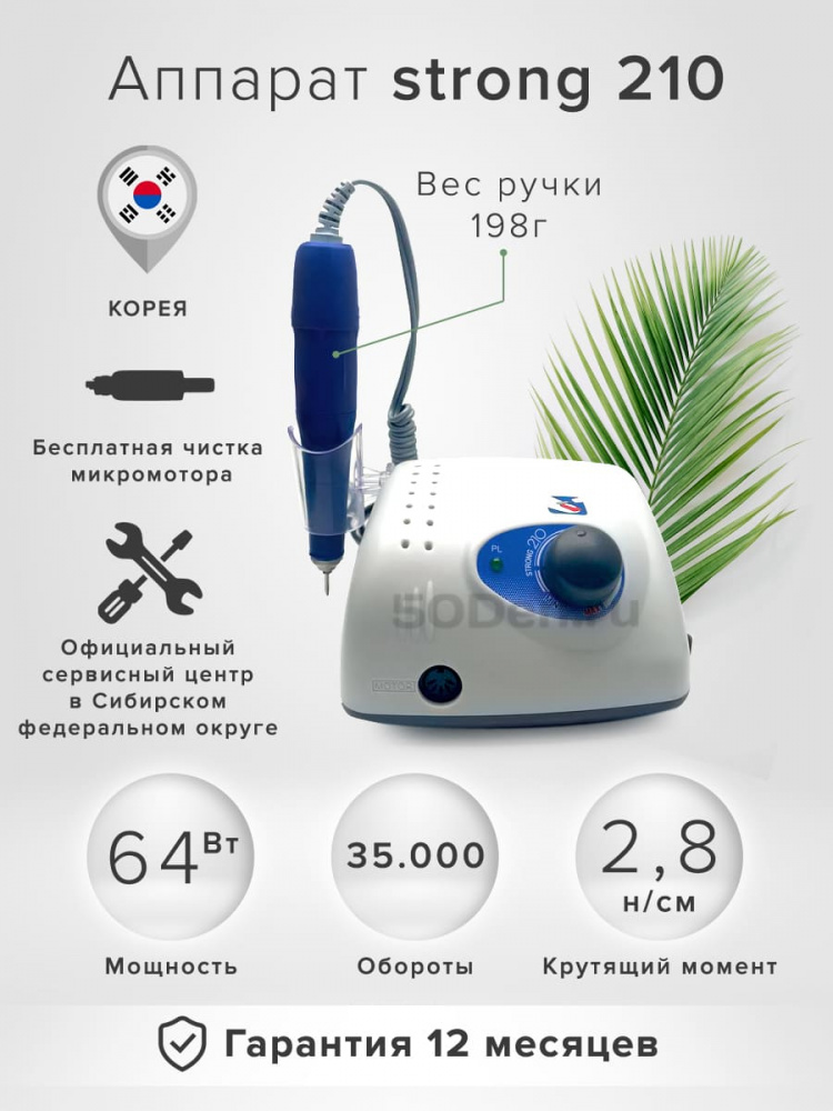 Оригинальный аппарат Saeshin Ю. Корея Компактный аппарат для проведения процедур маникюра, педикюра и наращивания ногтей Strong 210/105L. Мощность микромотора составляет 64 Ватта, скорость вращения 35,000 об/мин, имеется функция реверса. В комплект входит красивая и удобная сумка на молнии для переноски аппарата.